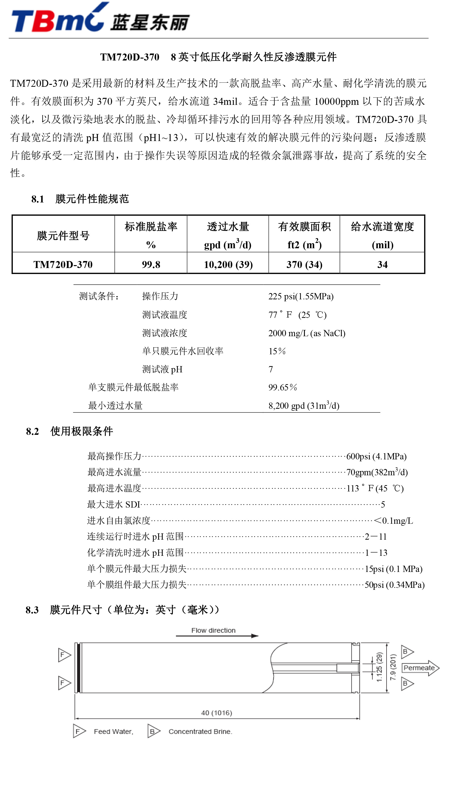 TM720D-370 是采用最新的材料及生產(chǎn)技術(shù)的一款高脫鹽率、高產(chǎn)水量、耐化學(xué)清洗的膜元 件。有效膜面積為 370 平方英尺,給水流道 34mil。適合于含鹽量 10000ppm 以下的苦咸水 淡化,以及微污染地表水的脫鹽、冷卻循環(huán)排污水的回用等各種應(yīng)用領(lǐng)域。TM720D-370 具 有最寬泛的清洗 pH 值范圍(pH1~13),可以快速有效的解決膜元件的污染問題;反滲透膜 片能夠承受一定范圍內(nèi),由于操作失誤等原因造成的輕微余氯泄露事故,提高了系統(tǒng)的安全 性。